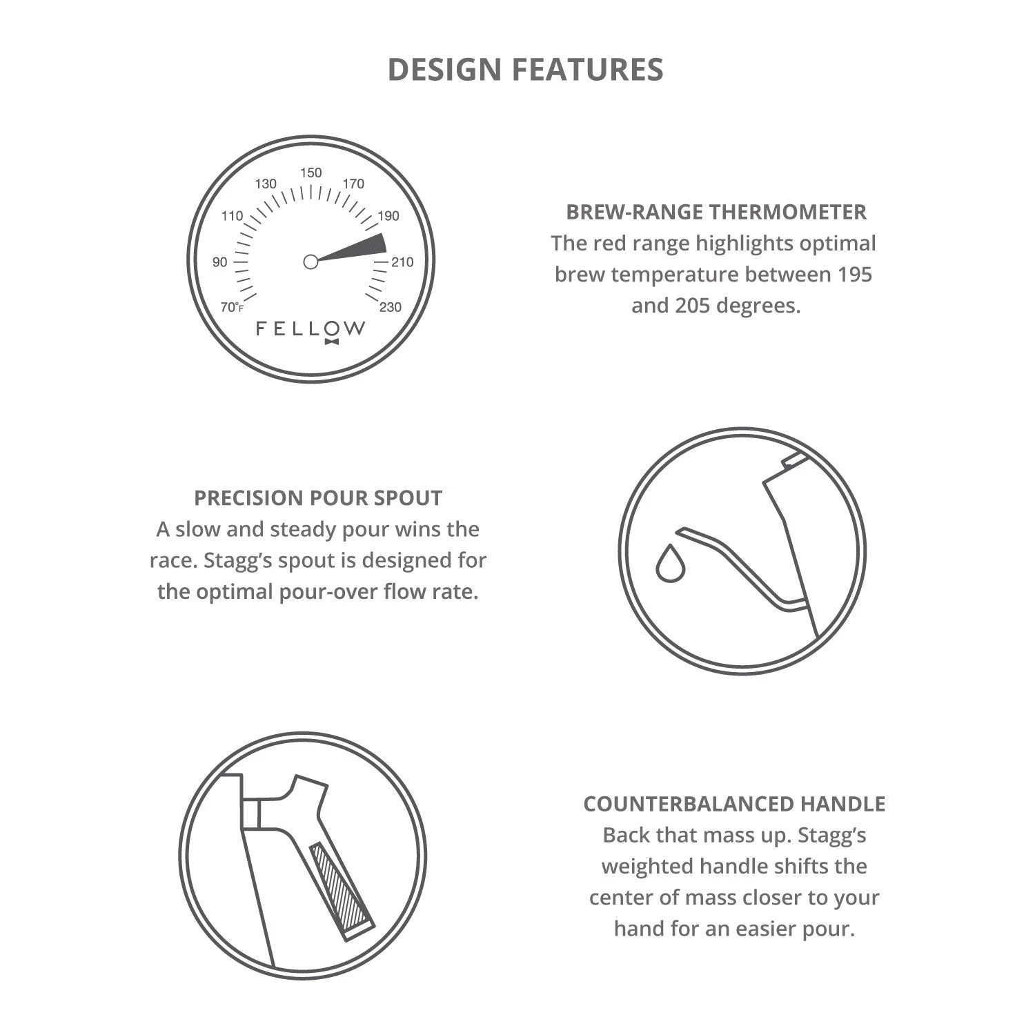 A built-in thermometer highlights the ideal brew range between 195 and 205 degrees Fahrenheit, and the counterbalanced handle shifts the weight of the kettle toward your hand for easier handling. Most importantly, the precision pour spout is designed for a slow, steady pour.