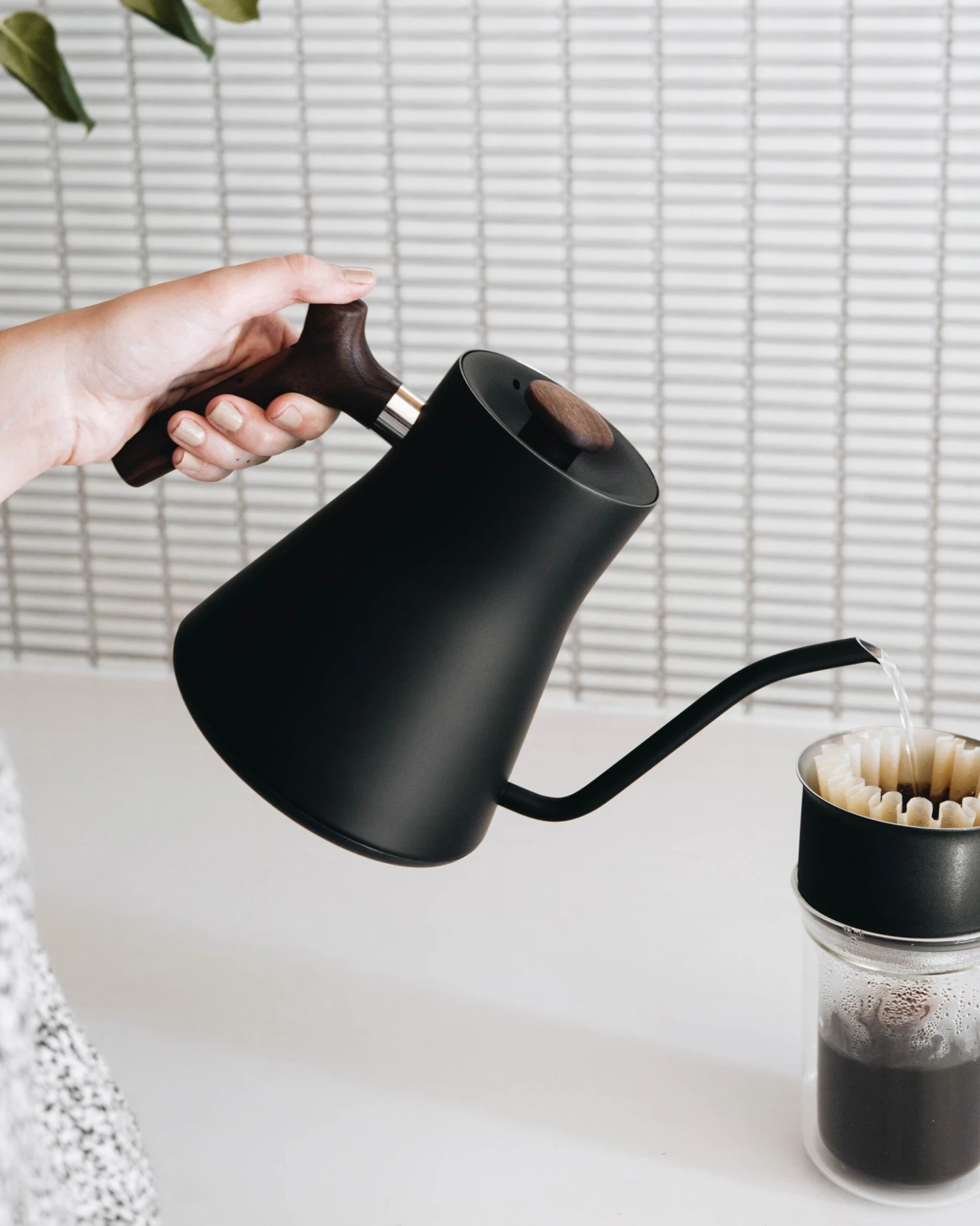 The Stagg EKG Electric Kettle is the epitome of pour over coffee perfected, and the matte black and walnut design adds the flair it deserves. The minimalist kettle holds 0.9 liters of water and comes with a base that fits comfortably on your counter top without taking up tons of space. The base of the kettle has an embedded PID temperature control to keep the water at a stable temperature, a 60-minute Hold Mode to maintain your desired temperature, whether in Fahrenheit or Celsius, for up to 1 hour and a quick heating time so that you can spend less time waiting for your perfect cup of coffee and more time crafting your pour over coffee.